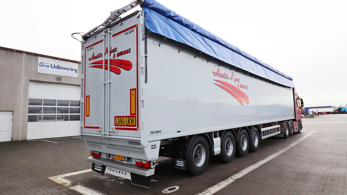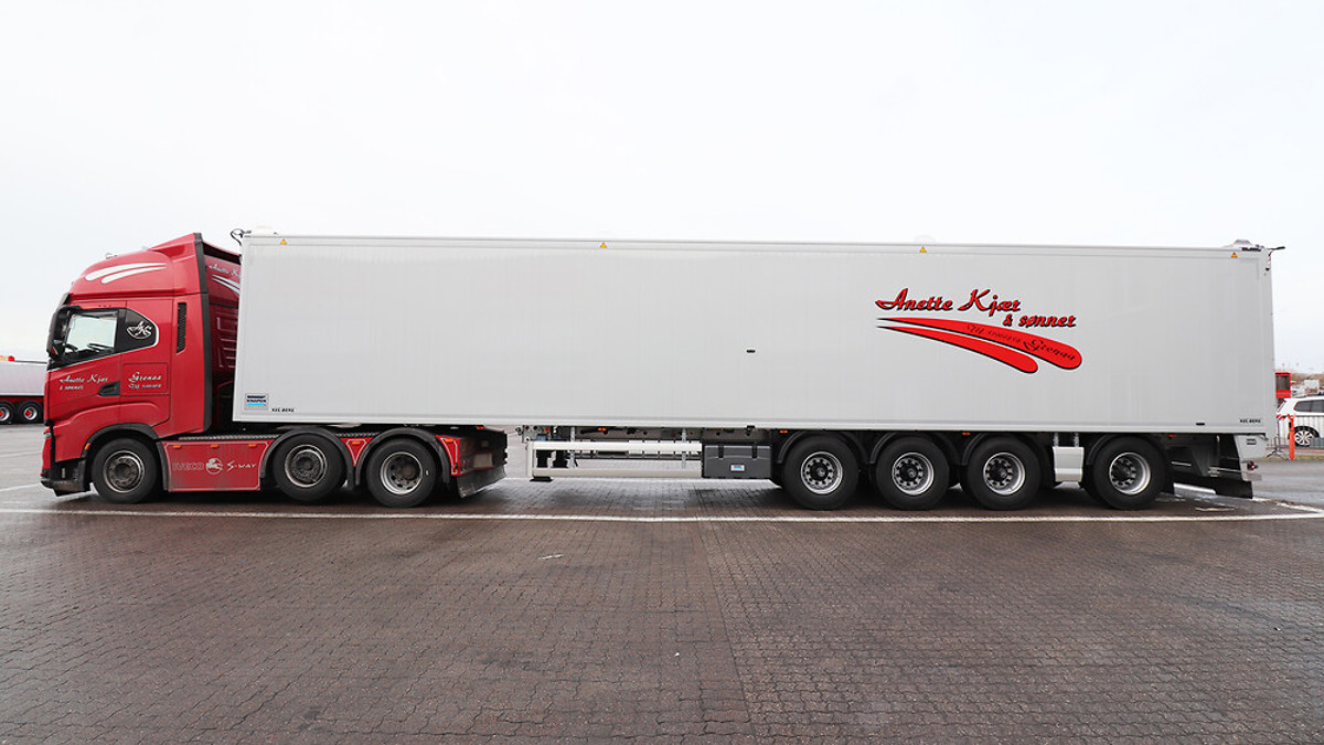 Vi har netop udvidet vores vognpark med 6 fabriksnye Knapen 4-akslede Walking Floor trailere på 15.000 mm med automatisk rullepresenning. Vi har planer om at komme op på 15 trailere i alt.